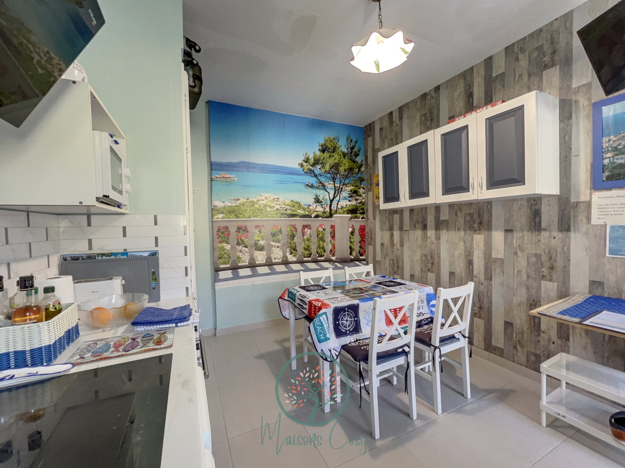 Salle à manger : Détendez vous dans notre espace de vie typique du cabanon des calanques. La décoration soignée crée une ambiance chaleureuse et accueillante.