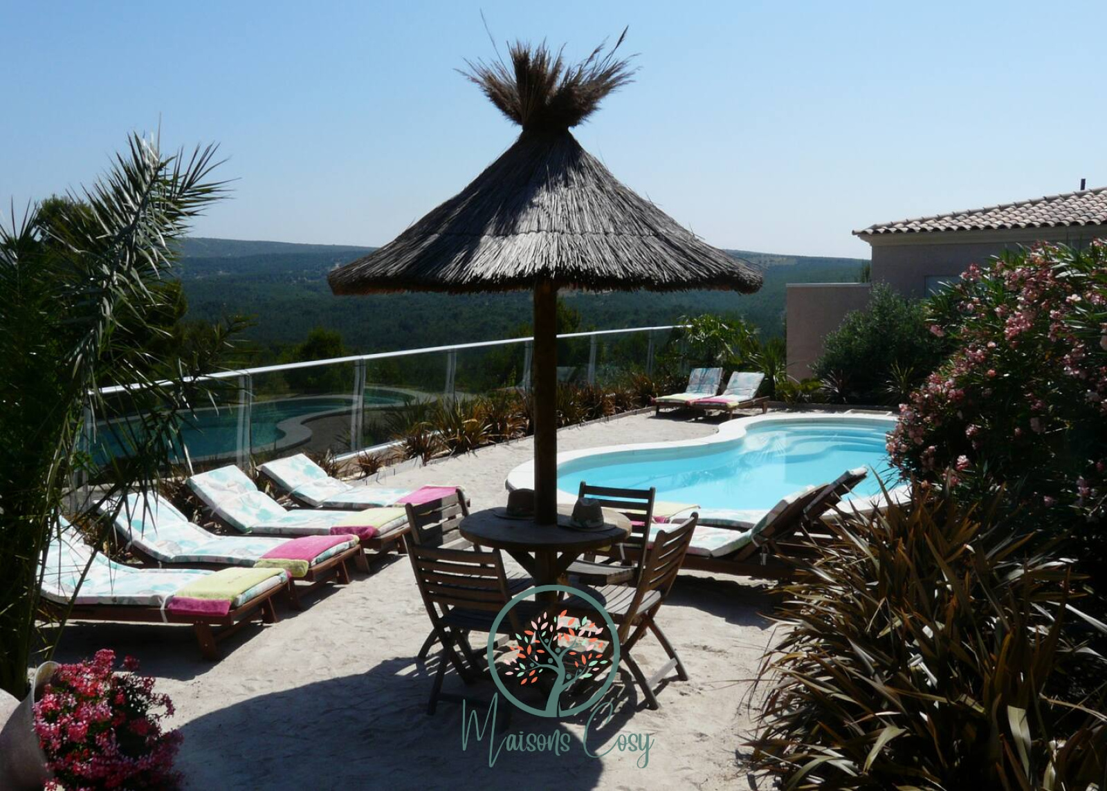 Au sein d’un domaine arboré et à l’esprit exotique, nous vous proposons un de nos 2 appartements composé d’une chambre avec grand lit 160x200, un espace salon avec canapé-lit, une table à manger et ses 4 chaises, une cuisine équipée, une salle d’eau et un WC séparé.