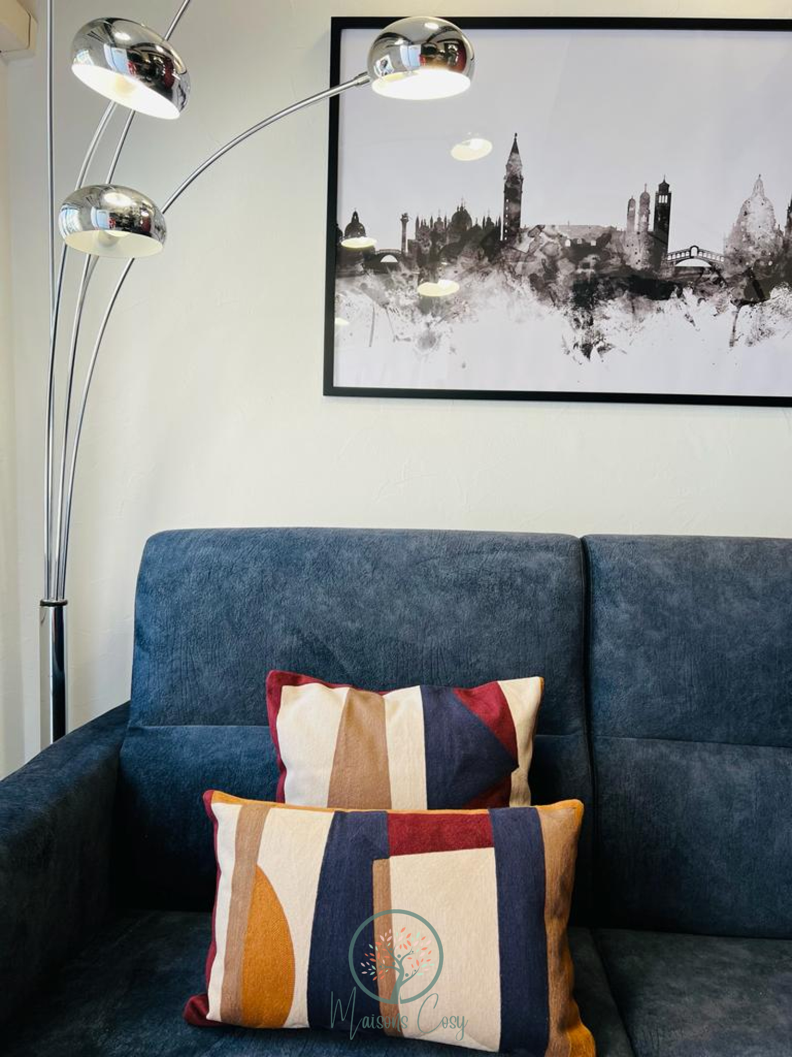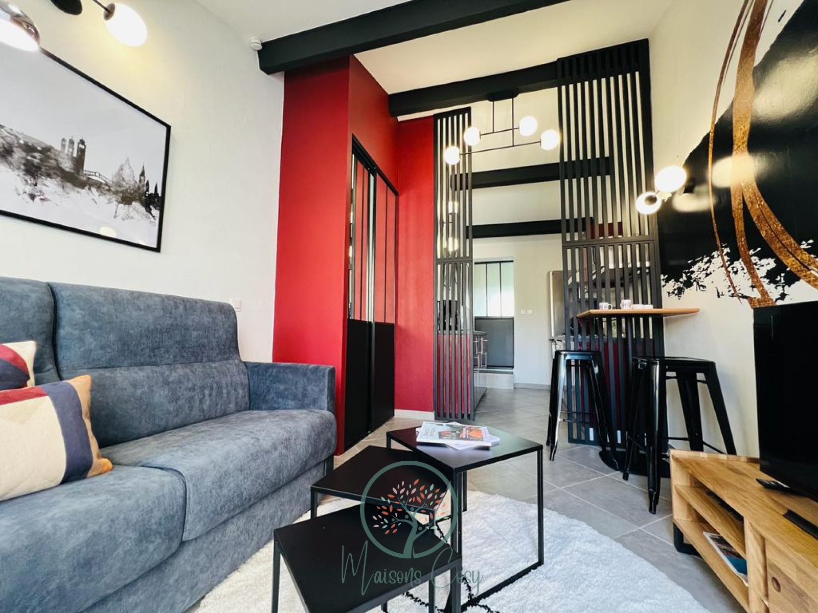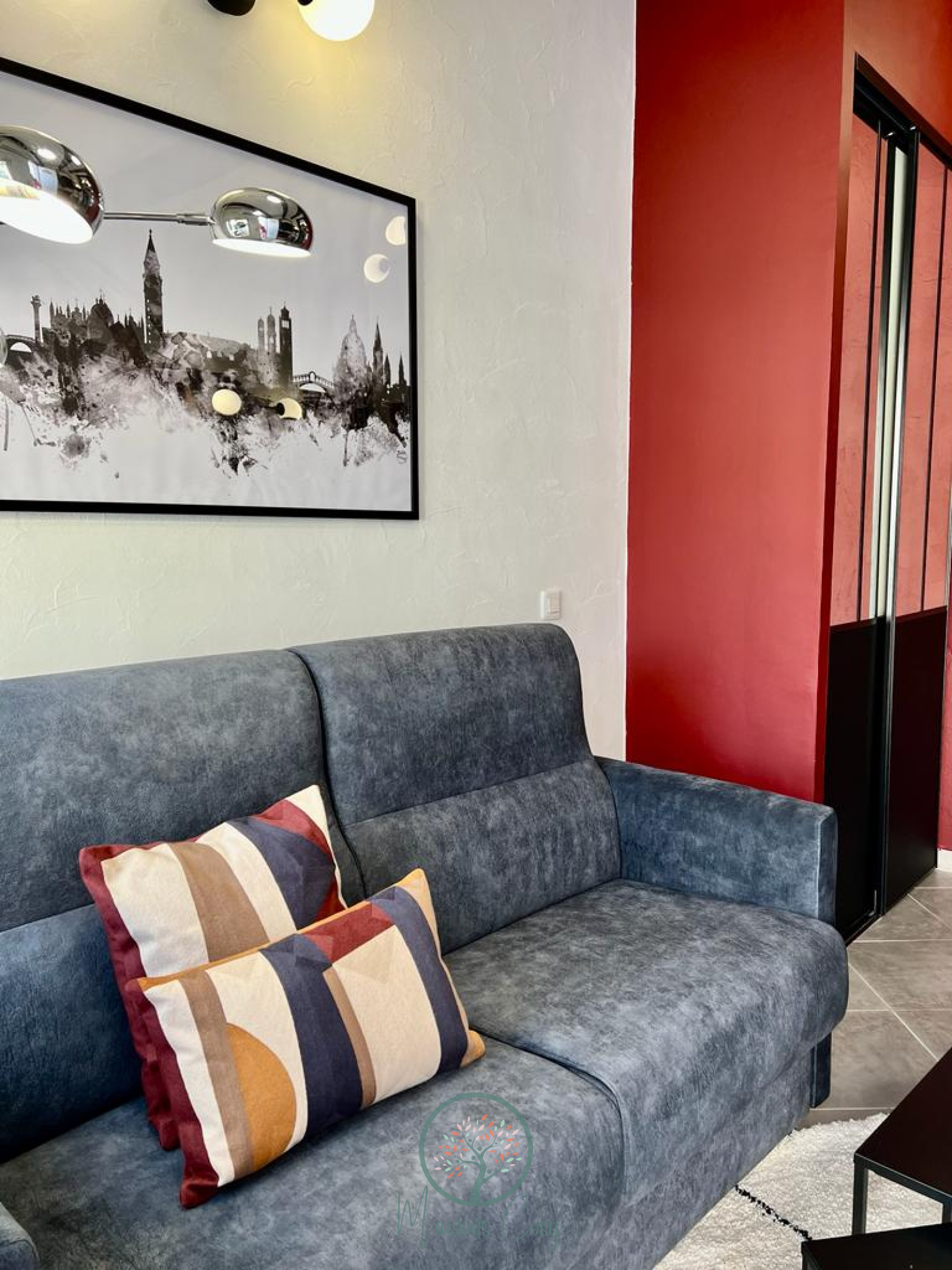 V Une grande pièce de vie avec un canapé lit doté d'un vrai matelas qualité hôtelière, un coin télévision connectée, un dressing.