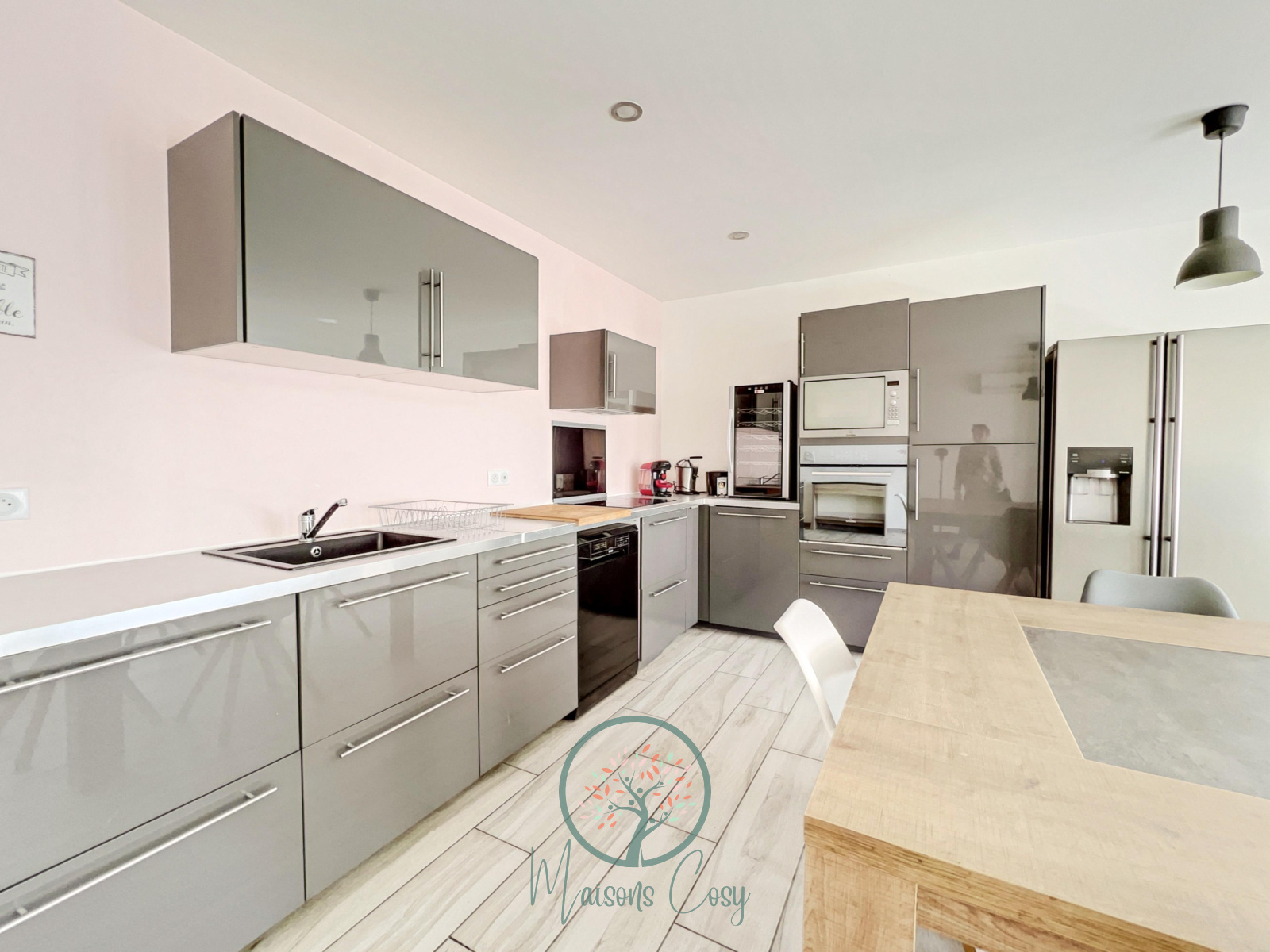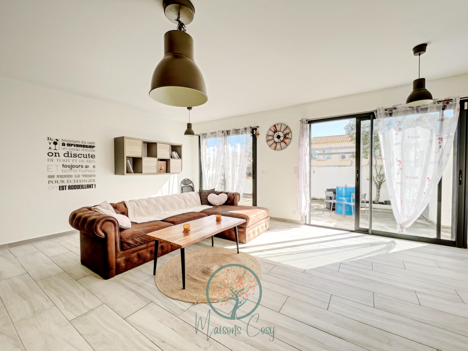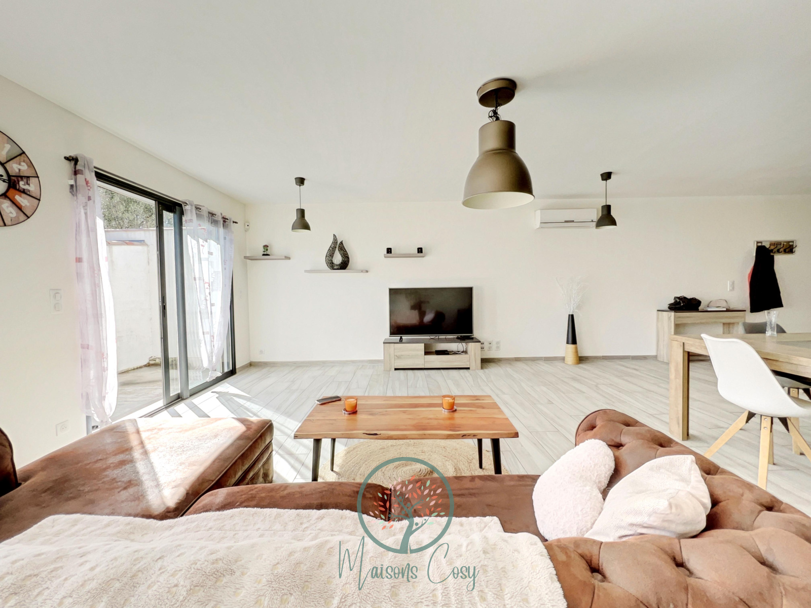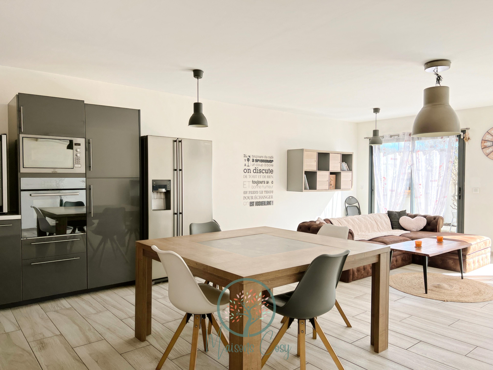 Un bel espace salon donnant sur la terrasse, avec cuisine entièrement aménagée, une grande table conviviale ainsi qu’un grand canapé.