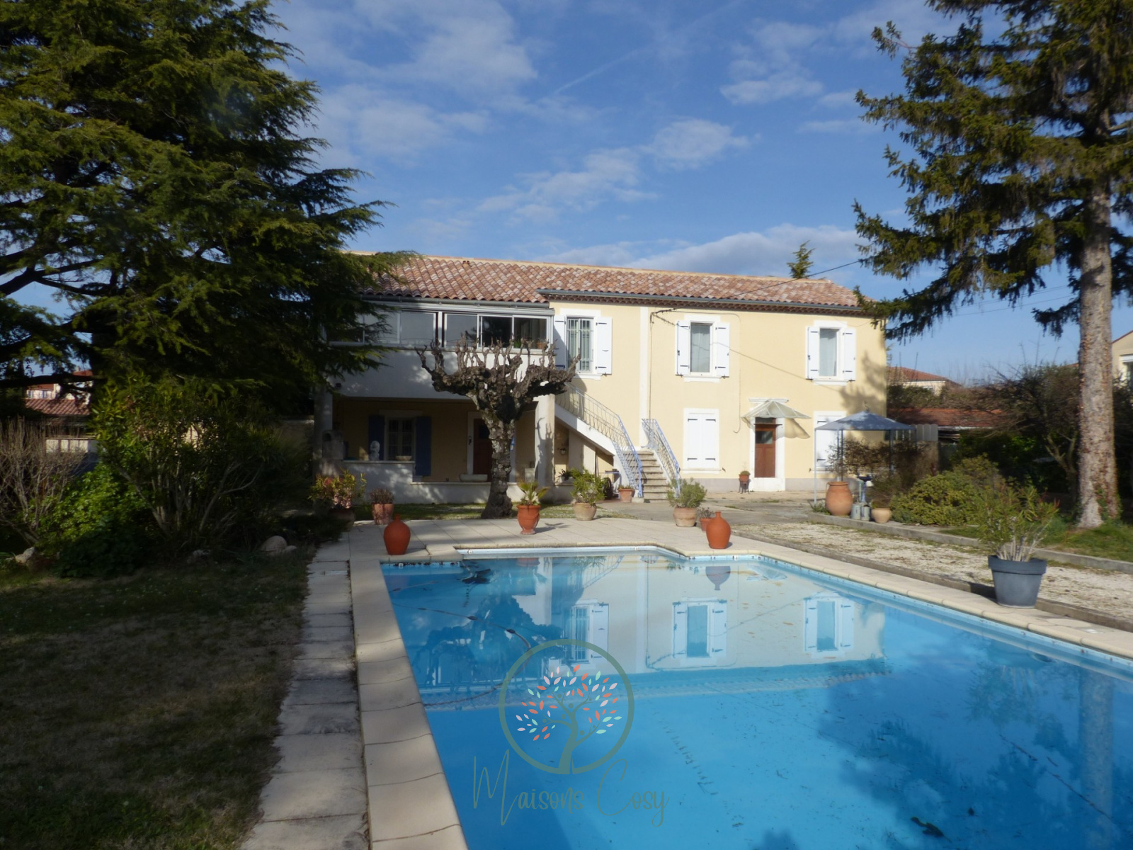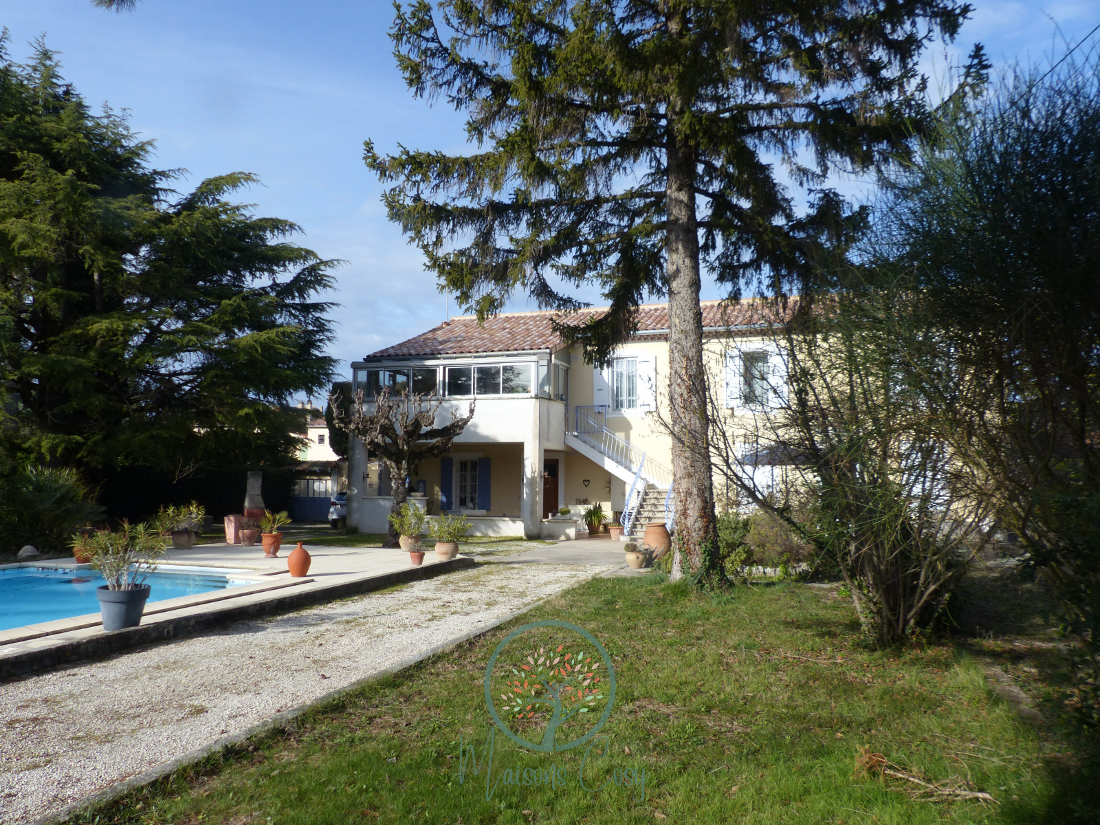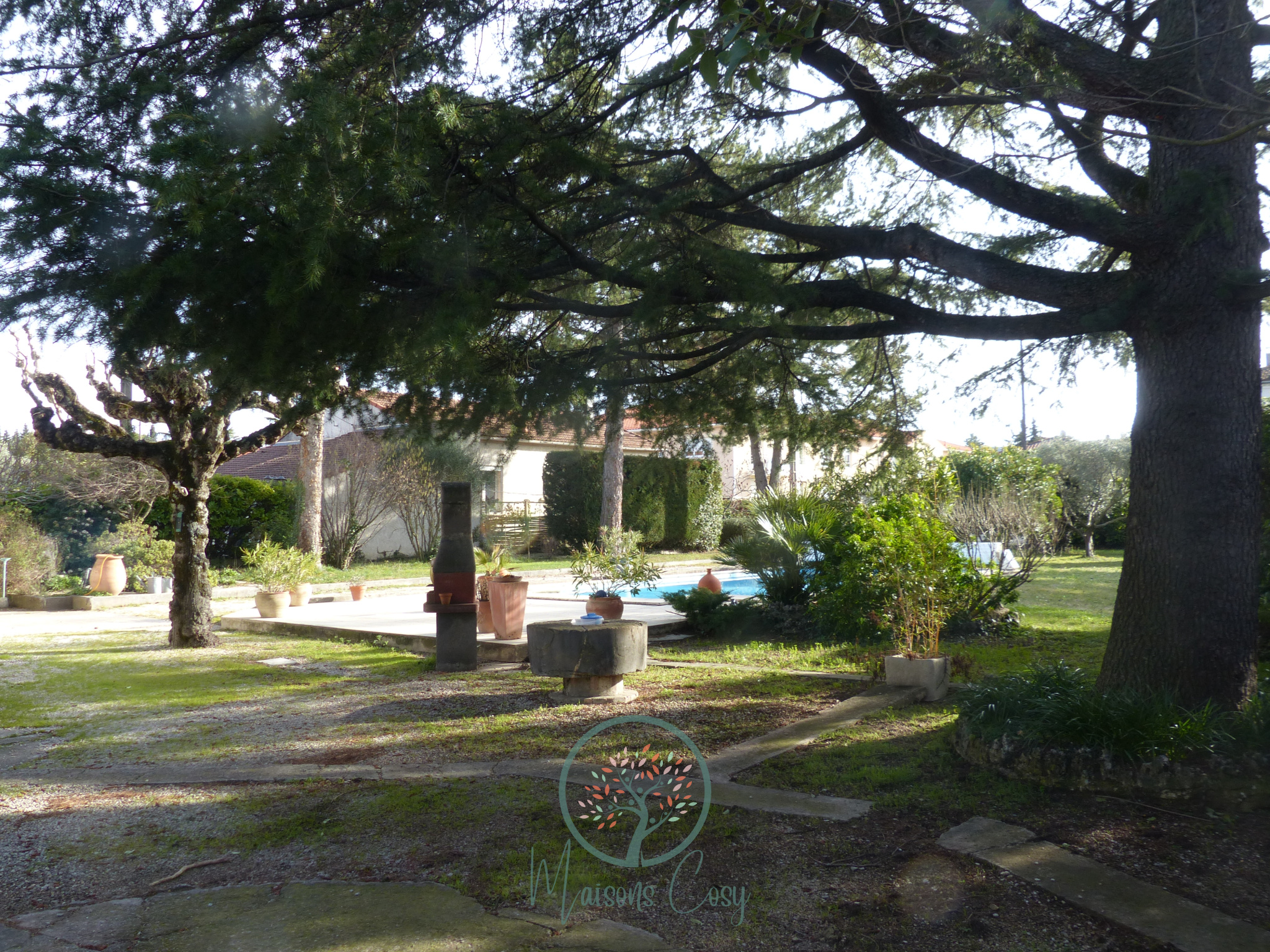 Elle possède un très beau terrain arboré et clôturé de 1720 m2 avec Piscine de 10x5,
