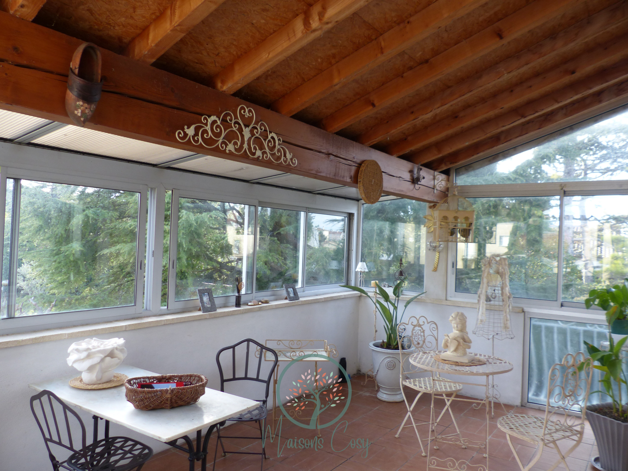 Une Véranda de 20 m2, une entrée donnant sur un séjour et sa cuisine ouverte et équipée, un salon , deux chambres, une salle de lecture, un bureau, une salle de bain avec wc,