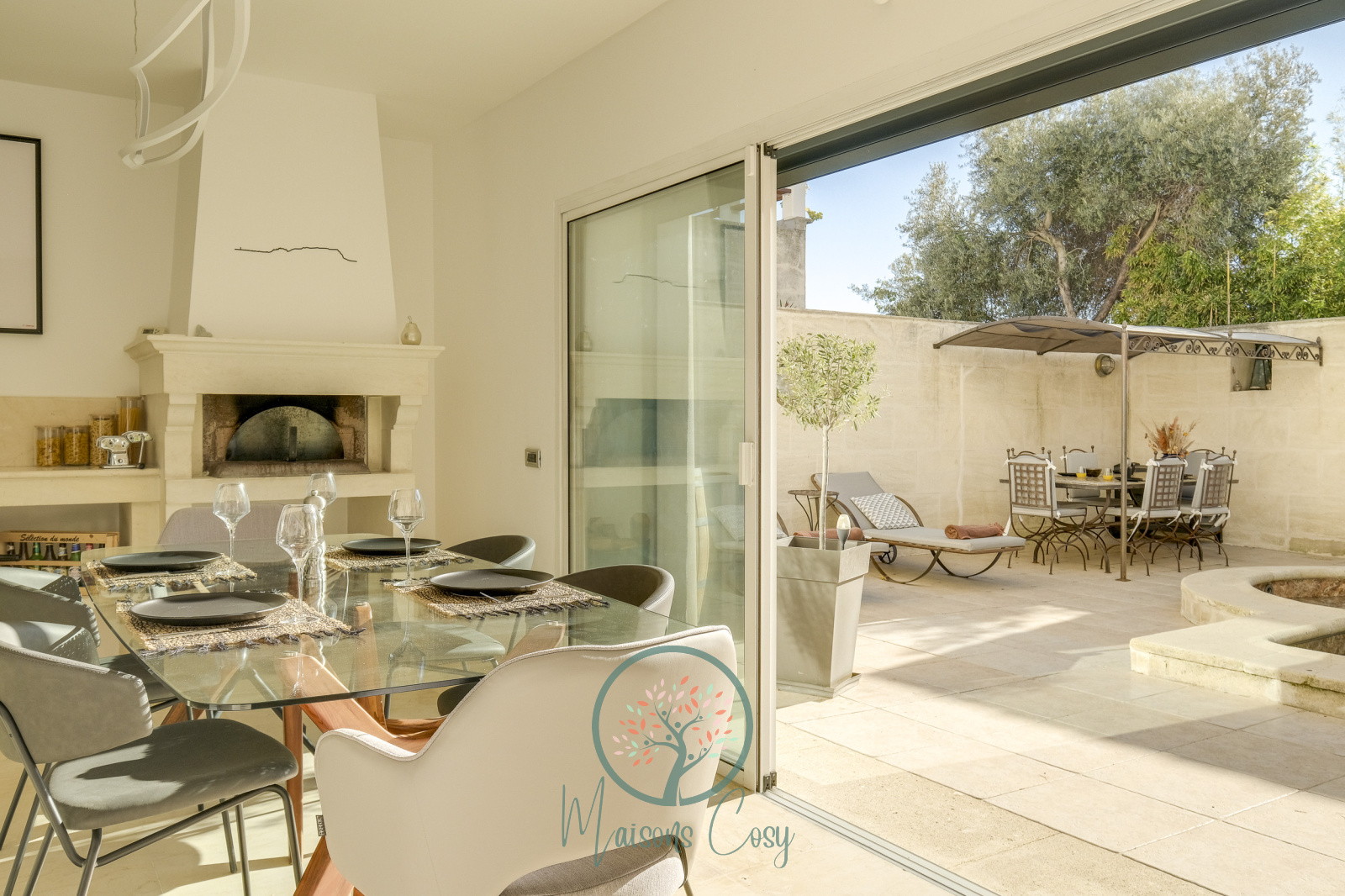 Cette villa a été entièrement rénovée avec goût et des matériaux de très belle qualité ....Vous ne pourrez que tomber sous le charme de ses poutres romaines, sa façade en pierres du Gard, son sol en marbre et de son espace piscine....