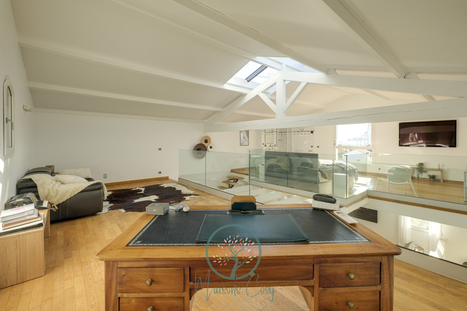 Au dernier étage et dans un esprit loft, se trouve le vaste bureau d'un côté et de l'autre la spacieuse et lumineuse suite parentale avec vue sur le port maritime !