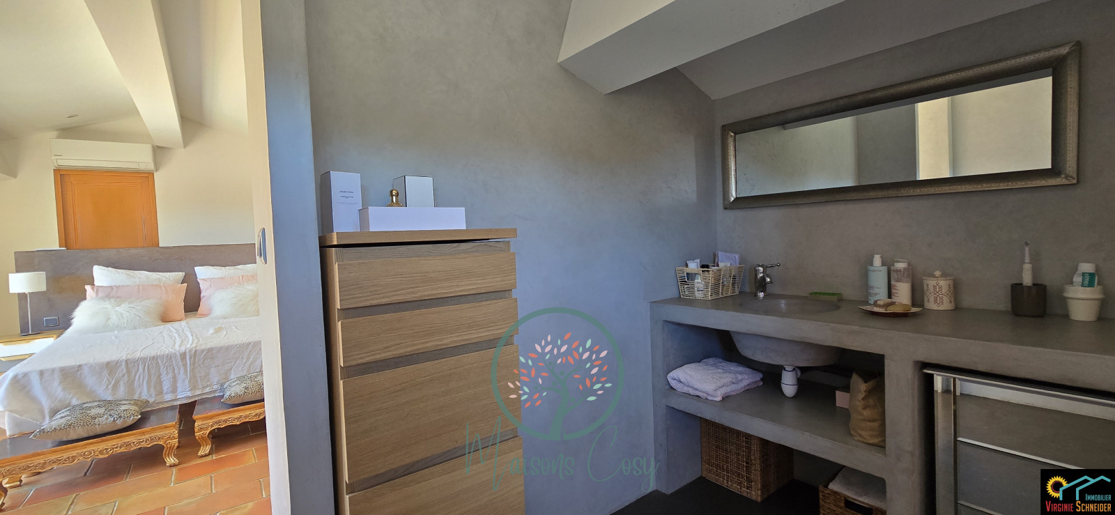 Le 1er étage, se compose de 3 chambres (dont une avec sa salle d'eau privée et sa terrasse), puis un WC séparé et une salle de bain.